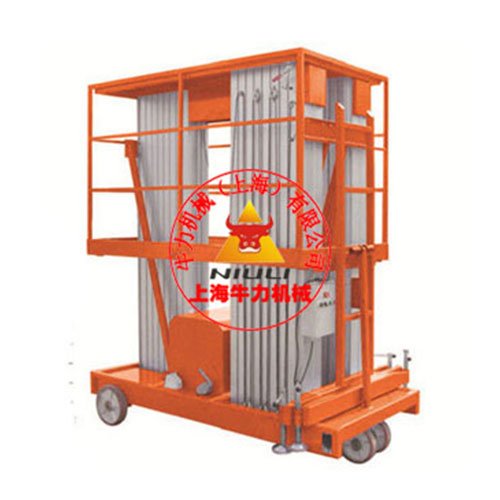 上海牛力机械铝合金升降机整机重量轻,机动性好,结构紧凑,可进入一般电梯以及狭小通道,特制的桅柱间导轨装置,使升降平稳自如。广泛适用于工厂、市政管理、树木检修、等用于载人高空作业设备。